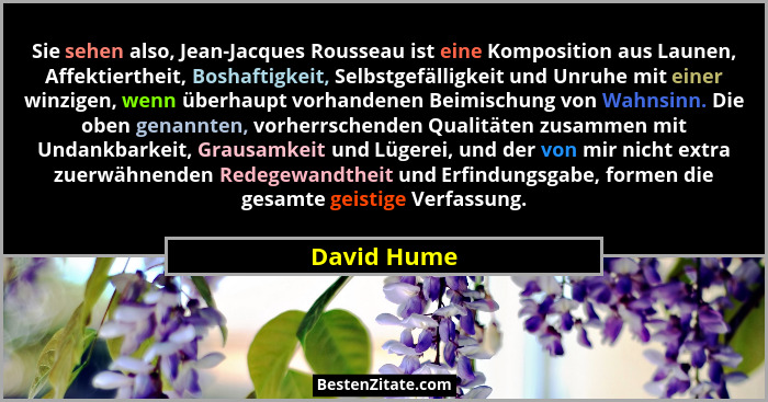 Sie sehen also, Jean-Jacques Rousseau ist eine Komposition aus Launen, Affektiertheit, Boshaftigkeit, Selbstgefälligkeit und Unruhe mit einer winzigen, wenn überhaupt vorhandenen Beimischung von Wahnsinn. Die oben genannten, vorherrschenden Qualitäten zusammen mit Undankbarkeit, Grausamkeit und Lügerei, und der von mir nicht extra zuerwähnenden Redegewandtheit und Erfindungsgabe, formen die gesamte geistige Verfassung.