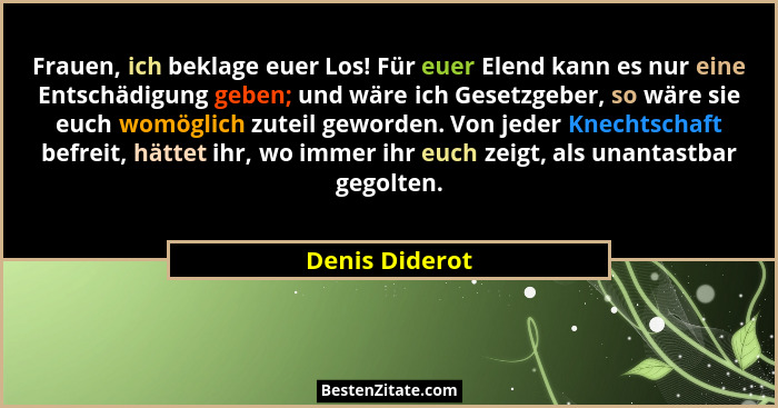 Frauen, ich beklage euer Los! Für euer Elend kann es nur eine Entschädigung geben; und wäre ich Gesetzgeber, so wäre sie euch womöglich zuteil geworden. Von jeder Knechtschaft befreit, hättet ihr, wo immer ihr euch zeigt, als unantastbar gegolten.
