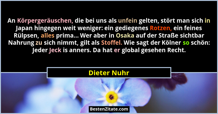 An Körpergeräuschen, die bei uns als unfein gelten, stört man sich in Japan hingegen weit weniger: ein gediegenes Rotzen, ein feines Rülpsen, alles prima... Wer aber in Osaka auf der Straße sichtbar Nahrung zu sich nimmt, gilt als Stoffel. Wie sagt der Kölner so schön: Jeder Jeck is anners. Da hat er global gesehen Recht.