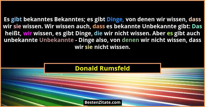 Es gibt bekanntes Bekanntes; es gibt Dinge, von denen wir wissen, dass wir sie wissen. Wir wissen auch, dass es bekannte Unbekannte gibt: Das heißt, wir wissen, es gibt Dinge, die wir nicht wissen. Aber es gibt auch unbekannte Unbekannte - Dinge also, von denen wir nicht wissen, dass wir sie nicht wissen.