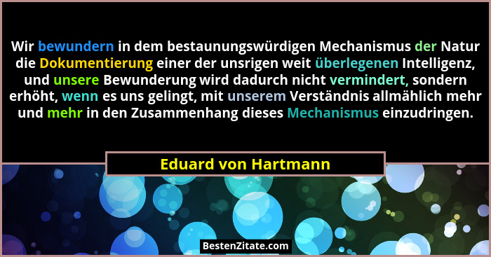 Wir bewundern in dem bestaunungswürdigen Mechanismus der Natur die Dokumentierung einer der unsrigen weit überlegenen Intelligenz, und unsere Bewunderung wird dadurch nicht vermindert, sondern erhöht, wenn es uns gelingt, mit unserem Verständnis allmählich mehr und mehr in den Zusammenhang dieses Mechanismus einzudringen.