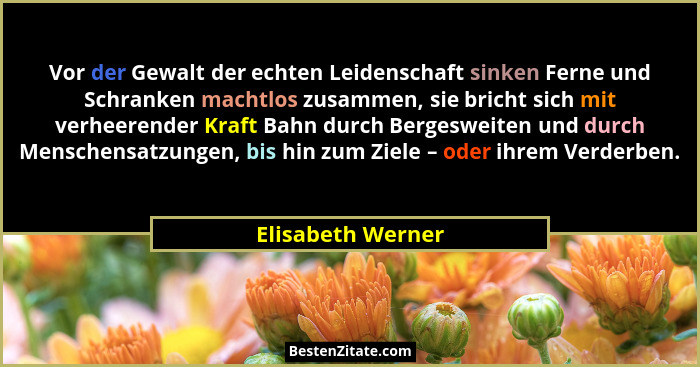 Vor der Gewalt der echten Leidenschaft sinken Ferne und Schranken machtlos zusammen, sie bricht sich mit verheerender Kraft Bahn durch Bergesweiten und durch Menschensatzungen, bis hin zum Ziele – oder ihrem Verderben.