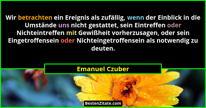 Wir betrachten ein Ereignis als zufällig, wenn der Einblick in die Umstände uns nicht gestattet, sein Eintreffen oder Nichteintreffen mit Gewißheit vorherzusagen, oder sein Eingetroffensein oder Nichteingetroffensein als notwendig zu deuten.