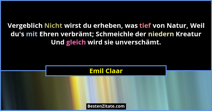 Vergeblich Nicht wirst du erheben, was tief von Natur, Weil du's mit Ehren verbrämt; Schmeichle der niedern Kreatur Und gleich wird sie unverschämt.