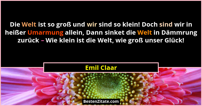 Die Welt ist so groß und wir sind so klein! Doch sind wir in heißer Umarmung allein, Dann sinket die Welt in Dämmrung zurück – Wie klein ist die Welt, wie groß unser Glück!