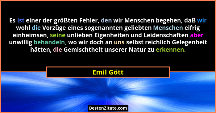 Es ist einer der größten Fehler, den wir Menschen begehen, daß wir wohl die Vorzüge eines sogenannten geliebten Menschen eifrig einheimsen, seine unlieben Eigenheiten und Leidenschaften aber unwillig behandeln, wo wir doch an uns selbst reichlich Gelegenheit hätten, die Gemischtheit unserer Natur zu erkennen.