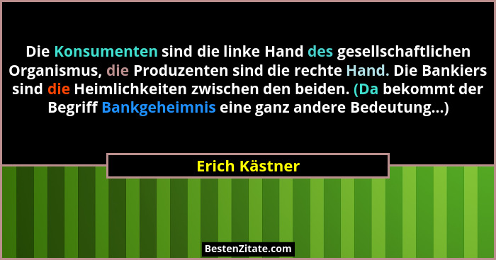 Die Konsumenten sind die linke Hand des gesellschaftlichen Organismus, die Produzenten sind die rechte Hand. Die Bankiers sind die Heimlichkeiten zwischen den beiden. (Da bekommt der Begriff Bankgeheimnis eine ganz andere Bedeutung...)