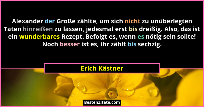 Alexander der Große zählte, um sich nicht zu unüberlegten Taten hinreißen zu lassen, jedesmal erst bis dreißig. Also, das ist ein wunderbares Rezept. Befolgt es, wenn es nötig sein sollte! Noch besser ist es, ihr zählt bis sechzig.