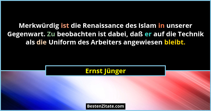 Merkwürdig ist die Renaissance des Islam in unserer Gegenwart. Zu beobachten ist dabei, daß er auf die Technik als die Uniform des Arbeiters angewiesen bleibt.