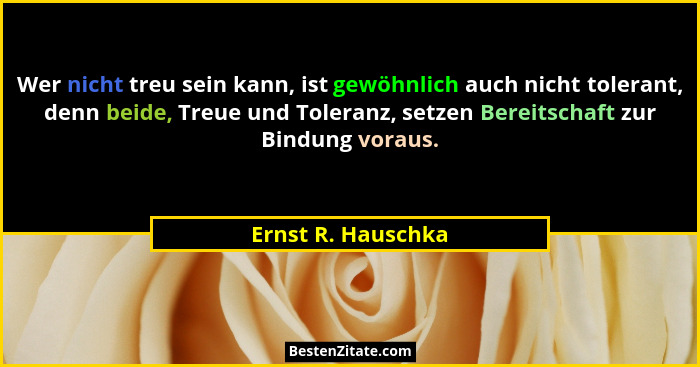 Wer nicht treu sein kann, ist gewöhnlich auch nicht tolerant, denn beide, Treue und Toleranz, setzen Bereitschaft zur Bindung voraus.