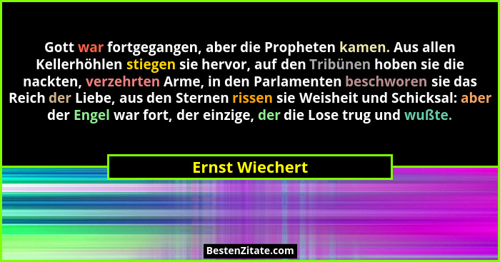 Gott war fortgegangen, aber die Propheten kamen. Aus allen Kellerhöhlen stiegen sie hervor, auf den Tribünen hoben sie die nackten, verzehrten Arme, in den Parlamenten beschworen sie das Reich der Liebe, aus den Sternen rissen sie Weisheit und Schicksal: aber der Engel war fort, der einzige, der die Lose trug und wußte.
