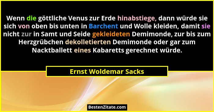 Wenn die göttliche Venus zur Erde hinabstiege, dann würde sie sich von oben bis unten in Barchent und Wolle kleiden, damit sie nicht zur in Samt und Seide gekleideten Demimonde, zur bis zum Herzgrübchen dekolletierten Demimonde oder gar zum Nacktballett eines Kabaretts gerechnet würde.