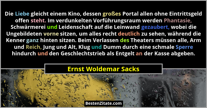 Die Liebe gleicht einem Kino, dessen großes Portal allen ohne Eintrittsgeld offen steht. Im verdunkelten Vorführungsraum werden Phantasie, Schwärmerei und Leidenschaft auf die Leinwand gezaubert, wobei die Ungebildeten vorne sitzen, um alles recht deutlich zu sehen, während die Kenner ganz hinten sitzen. Beim Verlassen des Theaters müssen alle, Arm und Reich, Jung und Alt, Klug und Dumm durch eine schmale Sperre hindurch und den Geschlechtstrieb als Entgelt an der Kasse abgeben.