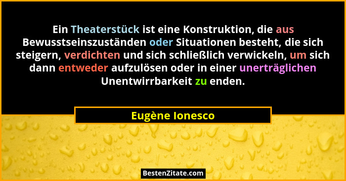 Ein Theaterstück ist eine Konstruktion, die aus Bewusstseinszuständen oder Situationen besteht, die sich steigern, verdichten und sich schließlich verwickeln, um sich dann entweder aufzulösen oder in einer unerträglichen Unentwirrbarkeit zu enden.