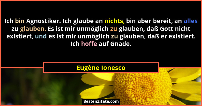 Ich bin Agnostiker. Ich glaube an nichts, bin aber bereit, an alles zu glauben. Es ist mir unmöglich zu glauben, daß Gott nicht existiert, und es ist mir unmöglich zu glauben, daß er existiert. Ich hoffe auf Gnade.