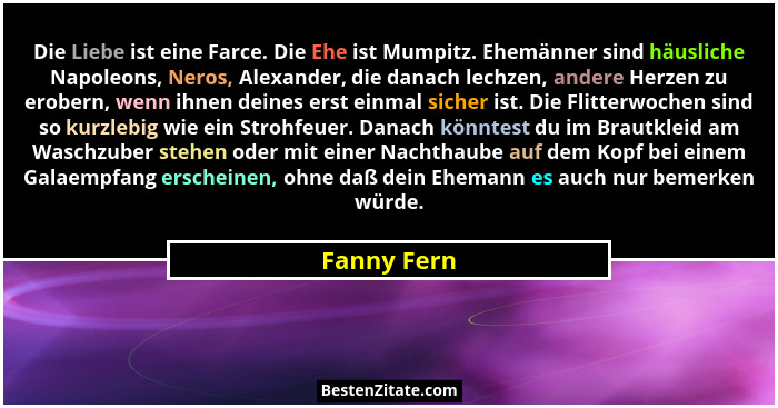 Die Liebe ist eine Farce. Die Ehe ist Mumpitz. Ehemänner sind häusliche Napoleons, Neros, Alexander, die danach lechzen, andere Herzen zu erobern, wenn ihnen deines erst einmal sicher ist. Die Flitterwochen sind so kurzlebig wie ein Strohfeuer. Danach könntest du im Brautkleid am Waschzuber stehen oder mit einer Nachthaube auf dem Kopf bei einem Galaempfang erscheinen, ohne daß dein Ehemann es auch nur bemerken würde.
