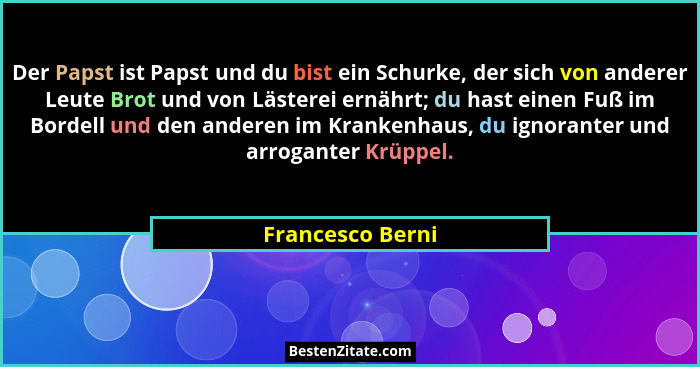 Der Papst ist Papst und du bist ein Schurke, der sich von anderer Leute Brot und von Lästerei ernährt; du hast einen Fuß im Bordell und den anderen im Krankenhaus, du ignoranter und arroganter Krüppel.