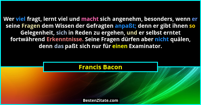 Wer viel fragt, lernt viel und macht sich angenehm, besonders, wenn er seine Fragen dem Wissen der Gefragten anpaßt; denn er gibt ihnen so Gelegenheit, sich in Reden zu ergehen, und er selbst erntet fortwährend Erkenntnisse. Seine Fragen dürfen aber nicht quälen, denn das paßt sich nur für einen Examinator.