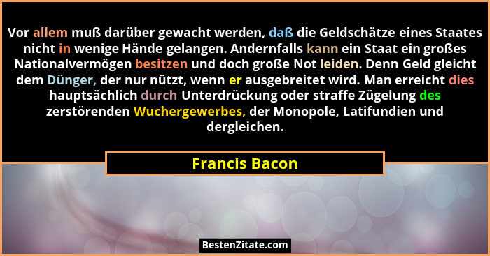 Vor allem muß darüber gewacht werden, daß die Geldschätze eines Staates nicht in wenige Hände gelangen. Andernfalls kann ein Staat ein großes Nationalvermögen besitzen und doch große Not leiden. Denn Geld gleicht dem Dünger, der nur nützt, wenn er ausgebreitet wird. Man erreicht dies hauptsächlich durch Unterdrückung oder straffe Zügelung des zerstörenden Wuchergewerbes, der Monopole, Latifundien und dergleichen.
