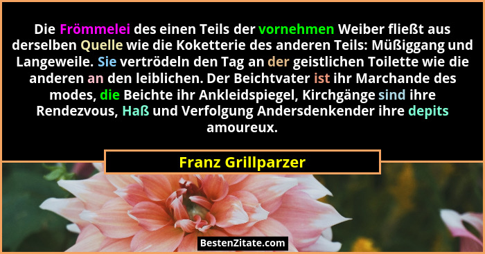 Die Frömmelei des einen Teils der vornehmen Weiber fließt aus derselben Quelle wie die Koketterie des anderen Teils: Müßiggang und Langeweile. Sie vertrödeln den Tag an der geistlichen Toilette wie die anderen an den leiblichen. Der Beichtvater ist ihr Marchande des modes, die Beichte ihr Ankleidspiegel, Kirchgänge sind ihre Rendezvous, Haß und Verfolgung Andersdenkender ihre depits amoureux.