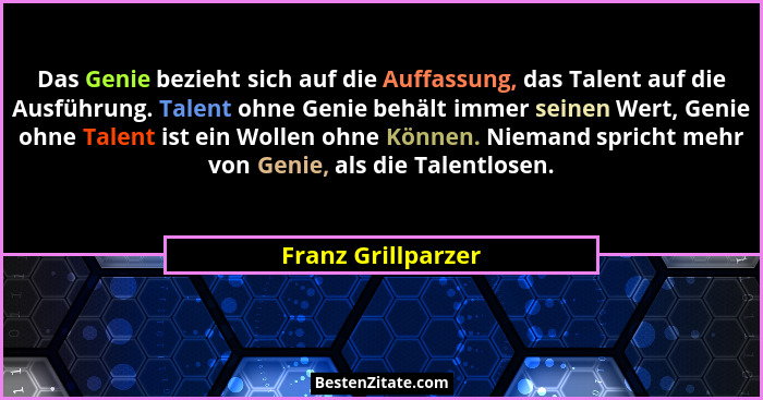 Das Genie bezieht sich auf die Auffassung, das Talent auf die Ausführung. Talent ohne Genie behält immer seinen Wert, Genie ohne Talent ist ein Wollen ohne Können. Niemand spricht mehr von Genie, als die Talentlosen.