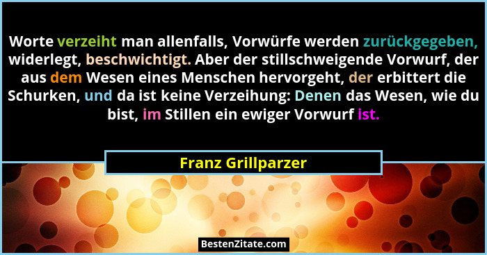 Worte verzeiht man allenfalls, Vorwürfe werden zurückgegeben, widerlegt, beschwichtigt. Aber der stillschweigende Vorwurf, der aus dem Wesen eines Menschen hervorgeht, der erbittert die Schurken, und da ist keine Verzeihung: Denen das Wesen, wie du bist, im Stillen ein ewiger Vorwurf ist.