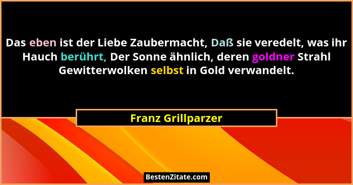 Das eben ist der Liebe Zaubermacht, Daß sie veredelt, was ihr Hauch berührt, Der Sonne ähnlich, deren goldner Strahl Gewitterwolken selbst in Gold verwandelt.