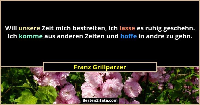 Will unsere Zeit mich bestreiten, ich lasse es ruhig geschehn. Ich komme aus anderen Zeiten und hoffe in andre zu gehn.