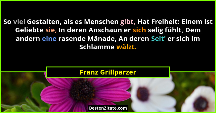 So viel Gestalten, als es Menschen gibt, Hat Freiheit: Einem ist Geliebte sie, In deren Anschaun er sich selig fühlt, Dem andern eine rasende Mänade, An deren Seit' er sich im Schlamme wälzt.