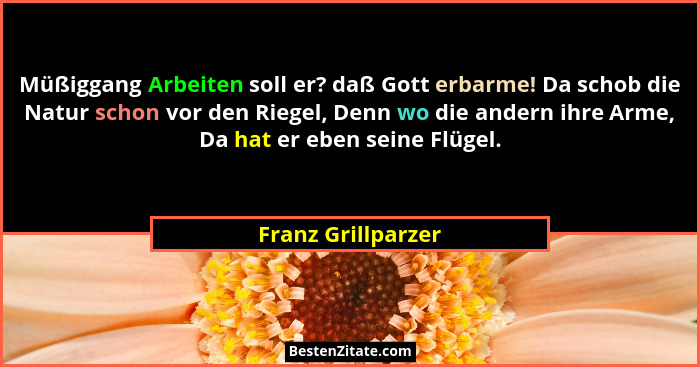 Müßiggang Arbeiten soll er? daß Gott erbarme! Da schob die Natur schon vor den Riegel, Denn wo die andern ihre Arme, Da hat er eben seine Flügel.