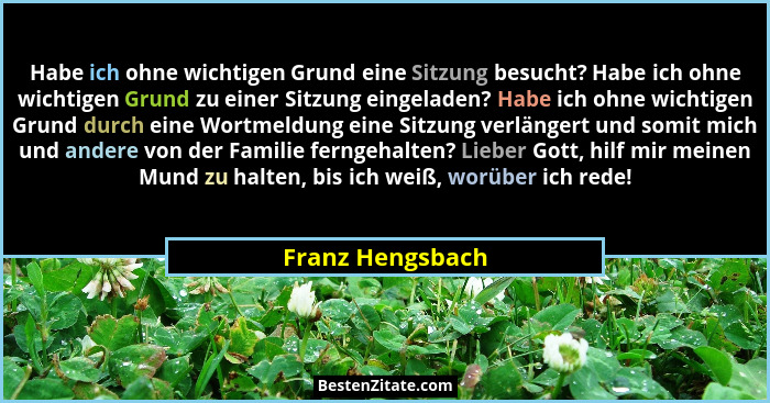 Habe ich ohne wichtigen Grund eine Sitzung besucht? Habe ich ohne wichtigen Grund zu einer Sitzung eingeladen? Habe ich ohne wichtigen Grund durch eine Wortmeldung eine Sitzung verlängert und somit mich und andere von der Familie ferngehalten? Lieber Gott, hilf mir meinen Mund zu halten, bis ich weiß, worüber ich rede!