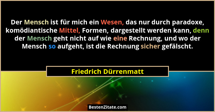 Der Mensch ist für mich ein Wesen, das nur durch paradoxe, komödiantische Mittel, Formen, dargestellt werden kann, denn der Mensch geht nicht auf wie eine Rechnung, und wo der Mensch so aufgeht, ist die Rechnung sicher gefälscht.