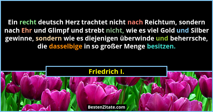 Ein recht deutsch Herz trachtet nicht nach Reichtum, sondern nach Ehr und Glimpf und strebt nicht, wie es viel Gold und Silber gewinne, sondern wie es diejenigen überwinde und beherrsche, die dasselbige in so großer Menge besitzen.
