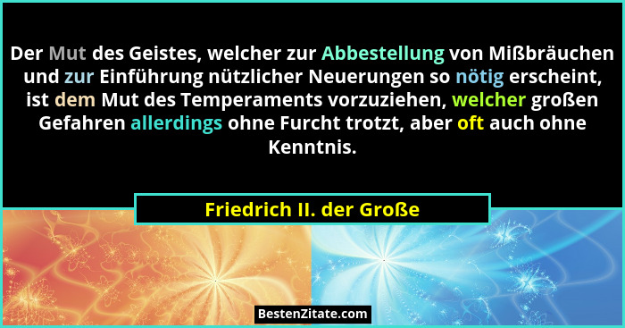 Der Mut des Geistes, welcher zur Abbestellung von Mißbräuchen und zur Einführung nützlicher Neuerungen so nötig erscheint, ist dem Mut des Temperaments vorzuziehen, welcher großen Gefahren allerdings ohne Furcht trotzt, aber oft auch ohne Kenntnis.