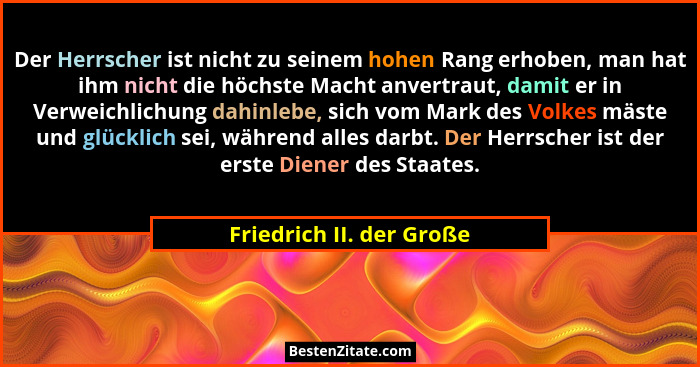 Der Herrscher ist nicht zu seinem hohen Rang erhoben, man hat ihm nicht die höchste Macht anvertraut, damit er in Verweichlichung dahinlebe, sich vom Mark des Volkes mäste und glücklich sei, während alles darbt. Der Herrscher ist der erste Diener des Staates.