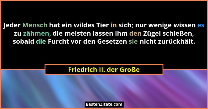 Jeder Mensch hat ein wildes Tier in sich; nur wenige wissen es zu zähmen, die meisten lassen ihm den Zügel schießen, sobald die Furcht vor den Gesetzen sie nicht zurückhält.
