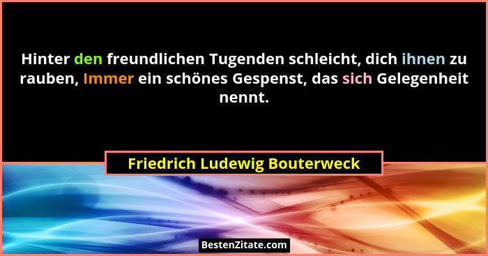 Hinter den freundlichen Tugenden schleicht, dich ihnen zu rauben, Immer ein schönes Gespenst, das sich Gelegenheit nennt.