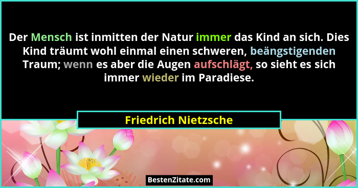 Der Mensch ist inmitten der Natur immer das Kind an sich. Dies Kind träumt wohl einmal einen schweren, beängstigenden Traum; wenn es aber die Augen aufschlägt, so sieht es sich immer wieder im Paradiese.