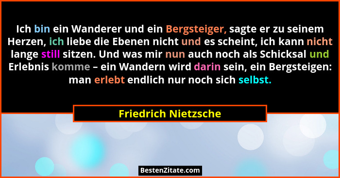 Ich bin ein Wanderer und ein Bergsteiger, sagte er zu seinem Herzen, ich liebe die Ebenen nicht und es scheint, ich kann nicht lange still sitzen. Und was mir nun auch noch als Schicksal und Erlebnis komme – ein Wandern wird darin sein, ein Bergsteigen: man erlebt endlich nur noch sich selbst.