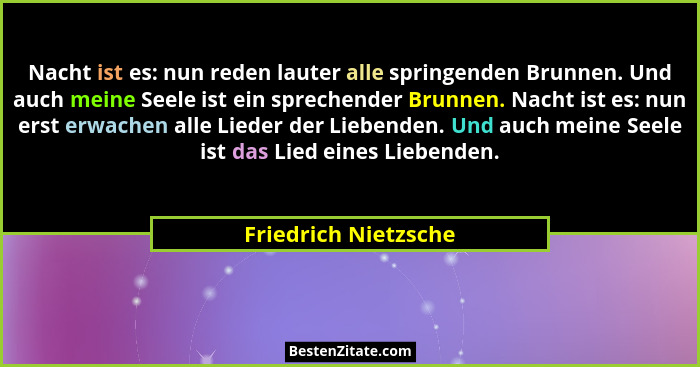 Nacht ist es: nun reden lauter alle springenden Brunnen. Und auch meine Seele ist ein sprechender Brunnen. Nacht ist es: nun erst erwachen alle Lieder der Liebenden. Und auch meine Seele ist das Lied eines Liebenden.