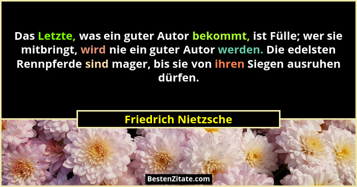 Das Letzte, was ein guter Autor bekommt, ist Fülle; wer sie mitbringt, wird nie ein guter Autor werden. Die edelsten Rennpferde sind mager, bis sie von ihren Siegen ausruhen dürfen.