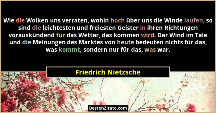 Wie die Wolken uns verraten, wohin hoch über uns die Winde laufen, so sind die leichtesten und freiesten Geister in ihren Richtungen vorauskündend für das Wetter, das kommen wird. Der Wind im Tale und die Meinungen des Marktes von heute bedeuten nichts für das, was kommt, sondern nur für das, was war.