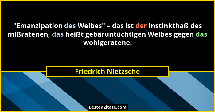 "Emanzipation des Weibes" – das ist der Instinkthaß des mißratenen, das heißt gebäruntüchtigen Weibes gegen das wohlgeratene.