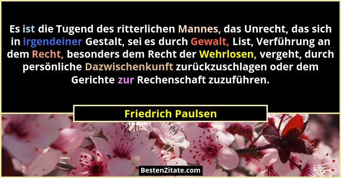 Es ist die Tugend des ritterlichen Mannes, das Unrecht, das sich in irgendeiner Gestalt, sei es durch Gewalt, List, Verführung an dem Recht, besonders dem Recht der Wehrlosen, vergeht, durch persönliche Dazwischenkunft zurückzuschlagen oder dem Gerichte zur Rechenschaft zuzuführen.