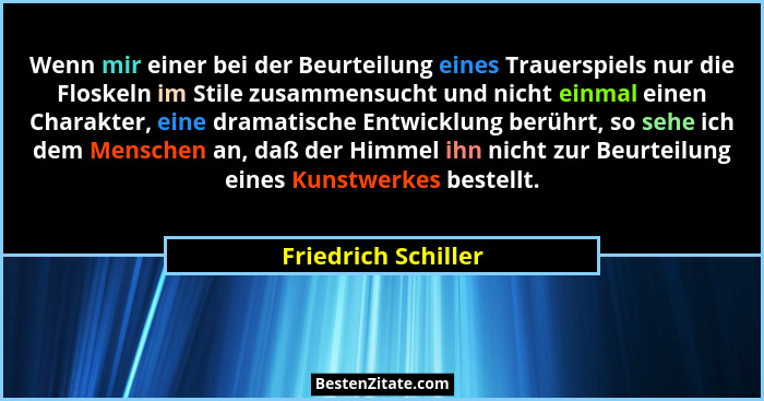 Wenn mir einer bei der Beurteilung eines Trauerspiels nur die Floskeln im Stile zusammensucht und nicht einmal einen Charakter, eine dramatische Entwicklung berührt, so sehe ich dem Menschen an, daß der Himmel ihn nicht zur Beurteilung eines Kunstwerkes bestellt.