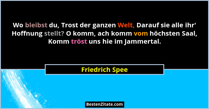 Wo bleibst du, Trost der ganzen Welt, Darauf sie alle ihr' Hoffnung stellt? O komm, ach komm vom höchsten Saal, Komm tröst uns hie im Jammertal.