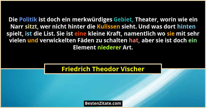 Die Politik ist doch ein merkwürdiges Gebiet, Theater, worin wie ein Narr sitzt, wer nicht hinter die Kulissen sieht. Und was dort hinten spielt, ist die List. Sie ist eine kleine Kraft, namentlich wo sie mit sehr vielen und verwickelten Fäden zu schalten hat, aber sie ist doch ein Element niederer Art.