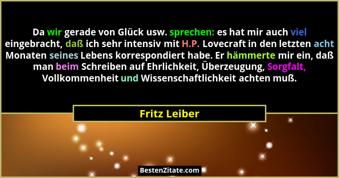 Da wir gerade von Glück usw. sprechen: es hat mir auch viel eingebracht, daß ich sehr intensiv mit H.P. Lovecraft in den letzten acht Monaten seines Lebens korrespondiert habe. Er hämmerte mir ein, daß man beim Schreiben auf Ehrlichkeit, Überzeugung, Sorgfalt, Vollkommenheit und Wissenschaftlichkeit achten muß.