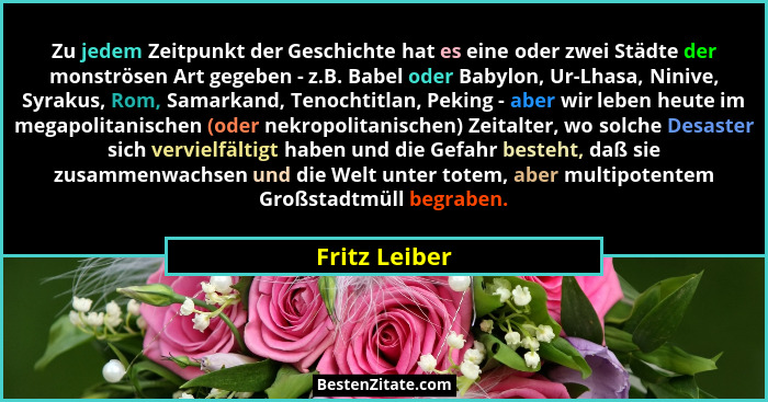 Zu jedem Zeitpunkt der Geschichte hat es eine oder zwei Städte der monströsen Art gegeben - z.B. Babel oder Babylon, Ur-Lhasa, Ninive, Syrakus, Rom, Samarkand, Tenochtitlan, Peking - aber wir leben heute im megapolitanischen (oder nekropolitanischen) Zeitalter, wo solche Desaster sich vervielfältigt haben und die Gefahr besteht, daß sie zusammenwachsen und die Welt unter totem, aber multipotentem Großstadtmüll begraben.