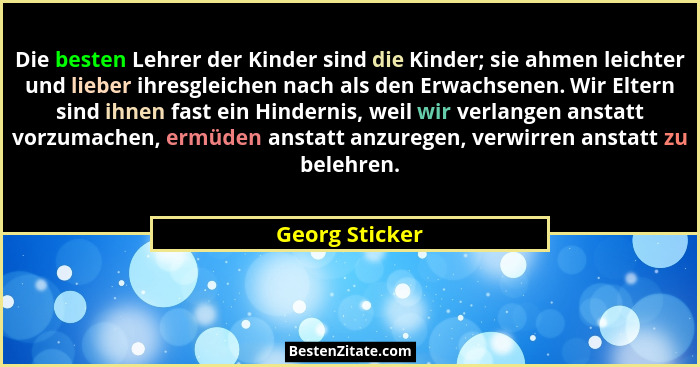 Die besten Lehrer der Kinder sind die Kinder; sie ahmen leichter und lieber ihresgleichen nach als den Erwachsenen. Wir Eltern sind ihnen fast ein Hindernis, weil wir verlangen anstatt vorzumachen, ermüden anstatt anzuregen, verwirren anstatt zu belehren.